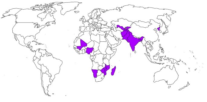 Ֆրանսիա, Նիգերիա, Սաուդյան Արաբիա, Պորտուգալիա, Ռուսաստան, Արգենտինա, Սիրիա, Կանադա, Ճապոնիա, Պակիստան, Հնդկաստան, Բելգիա, Գերմանիա, Իտալիա, Չինաստան, Ալժիր, Հայաստան, Ուկրաինա, Իսպանիա, Քենիա, Կամերուն, Մալթա, Ինդոնեզիա, Ավստրալիա, Չադ, Նոր Զելանդիա, Հունաստան, Եմեն