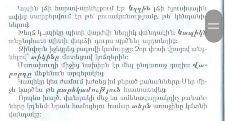 10.Ծովը խաղաղ էր քնաց երախայի նման։ Արևը դեռ չէր ծագել, և վաղորդյանի լռության մեջ ինչ-որ խորհուրդ կար։ Թվում էր, թե ամբողջ աշխարհն է խաղաղ քնաց: Բայց մի մարդ միայնակ նստած էր ծովափի խոնավ ավազին։ Ինչ՞ն էր այդքան վաղ ծաովափ բերել նրան։ Այդ մարդը չուներ ոչ ընտանիք, ոչ էլ հարազատ։ Նա միշտ ուրախ և լավ էր զգում ծովի ափի մոտ։ Նա ամեն օր վաղ առավոտյան, գալիս էր ծովափ, երբ դեռ լույսը լավ չէր բացվել։Նա նստում են ավազին և նայում, թե ինչպես է ալիքները գալիս իրեն ընդառաջ։ Եվ նա իր մենակությունը անցկացնում էր այդ ծովի հետ։